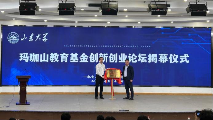 王福安在开场致辞中指出,学院以党的二十大精神为指引,从建设科技强国对人才的需求出发,积极培育大学生创新创业项目,助力科技强国建设,玛珈山教育基金是校友与学院之间深厚情感的纽带,校友们饮水思源助推学院青年学子不断勇于创新,不断追求进步,为社会发展作出贡献。王福安和孙宁共同为玛珈山教育基金创新创业论坛揭牌,标志着学院特色科创育人体系树立新里程碑。
