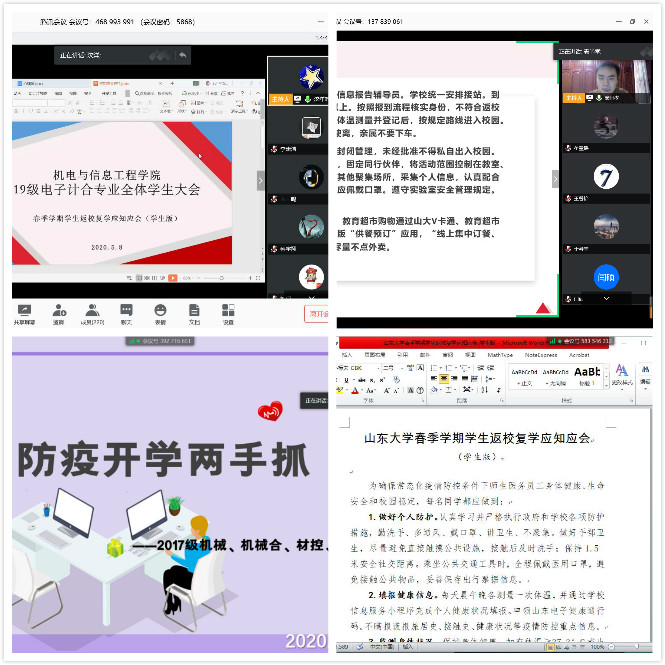 学生工作队伍通过多种方式向全体同学传达落实学校疫情防控及返校工作安排。5月8日上午,学院召开辅导员工作会议,向全体辅导员专题传达此次疫情防控与返校工作部署会议精神并进行工作部署。5月8日晚,学院辅导员分别通过企业微信、welink等会议平台召开各年级本科生、研究生班会,向全体学生传达了学校疫情防控及返校工作会议精神,领学了《德赢vwin官方入口春季学期学生返校复学应知应会》(学生版)文件内容,强调要从国际、国内、学校等几个层面认清当前疫情形势,提高思想认识,明确自身责任,严格执行学校疫情防控工作要求,辅导员还就学生提出关于返校、居家学习等问题进行了详细解答。