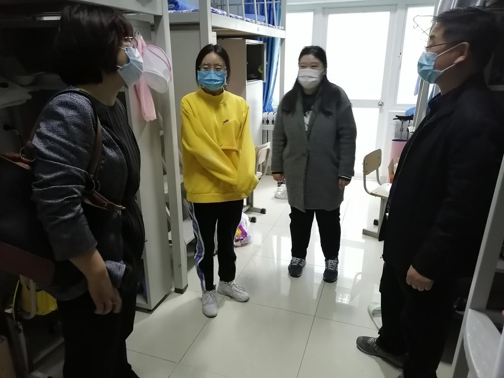 4月30日上午,我院党委书记彭兆强,常务副院长、党委副书记王丽,党委副书记高佚婧及辅导员李捷、孙宁一行五人到学生宿舍走访看望疫情期间留校学生,了解留校学生的学习生活情况,向留校学生宣传疫情防控注意事项,为留校学生送去学校和学院五一节日问候和关怀。