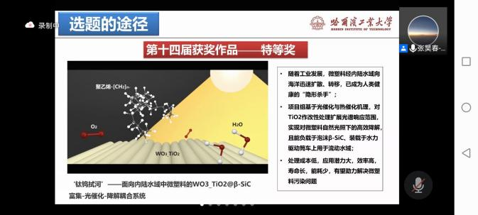 会上,张昊春做了题为“文章自得方为贵——在创新中管窥不一样的自我”的报告,全面介绍了科学发现与技术变革中的创新精神与创造思维,指出其对培养同学们的综合素质、提升核心竞争力的重要意义。他首先介绍了国家级大学生创新创业训练计划平台的功能,指出该平台倡导以本科学生为主体的创新性实验改革,有效调动了学生们的主动性、积极性和创造性,充分激发了学生的创新思维和创新意识,全面提升了学生的创新实验能力。其次,张昊春详细说明了全国大学生节能减排社会实践与科技创新大赛的相关事宜,对竞赛发展历程、宗旨、制度体系、社会影响力、奖励进行逐一讲解。张昊春还重点阐释了竞赛流程,包括前期准备时间和注意事项及后期评审的关注重点等细节,强调了在整个竞赛准备中选题的重要性,并和同学们分享了如何选取优秀选题的经验。最后,张昊春着重向与会同学强调了参与竞赛对自身成长发展的重要意义,鼓励大家积极参与节能减排社会实践和科技创新竞赛等一系列创新创业大赛,全面提升自身动手实践能力。