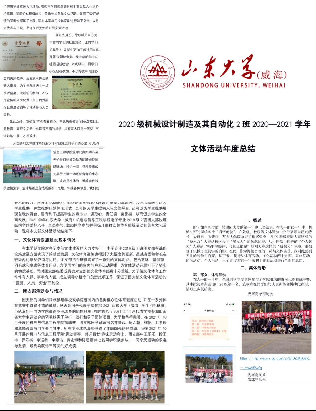 为落实德赢vwin官方入口全面加强和改进新时代学生美育工作要求,弘扬中华美育精神,培养德智体美劳全面发展的社会主义建设者和接班人,德赢AC米兰官网于2021年11月至12月开展“风华正茂,向美同行”文化艺术节活动,活动由“笔墨情韵,共绘青春”书画展、“冬日漫景,映像山大”摄影展、“舞动青春,梦想起航”才艺大赛和“一班一品”班级美育体育风采展四部分组成。参与人员涵盖学院2019级到2021级所有班级,活动得到了同学们的积极响应和广泛参与。