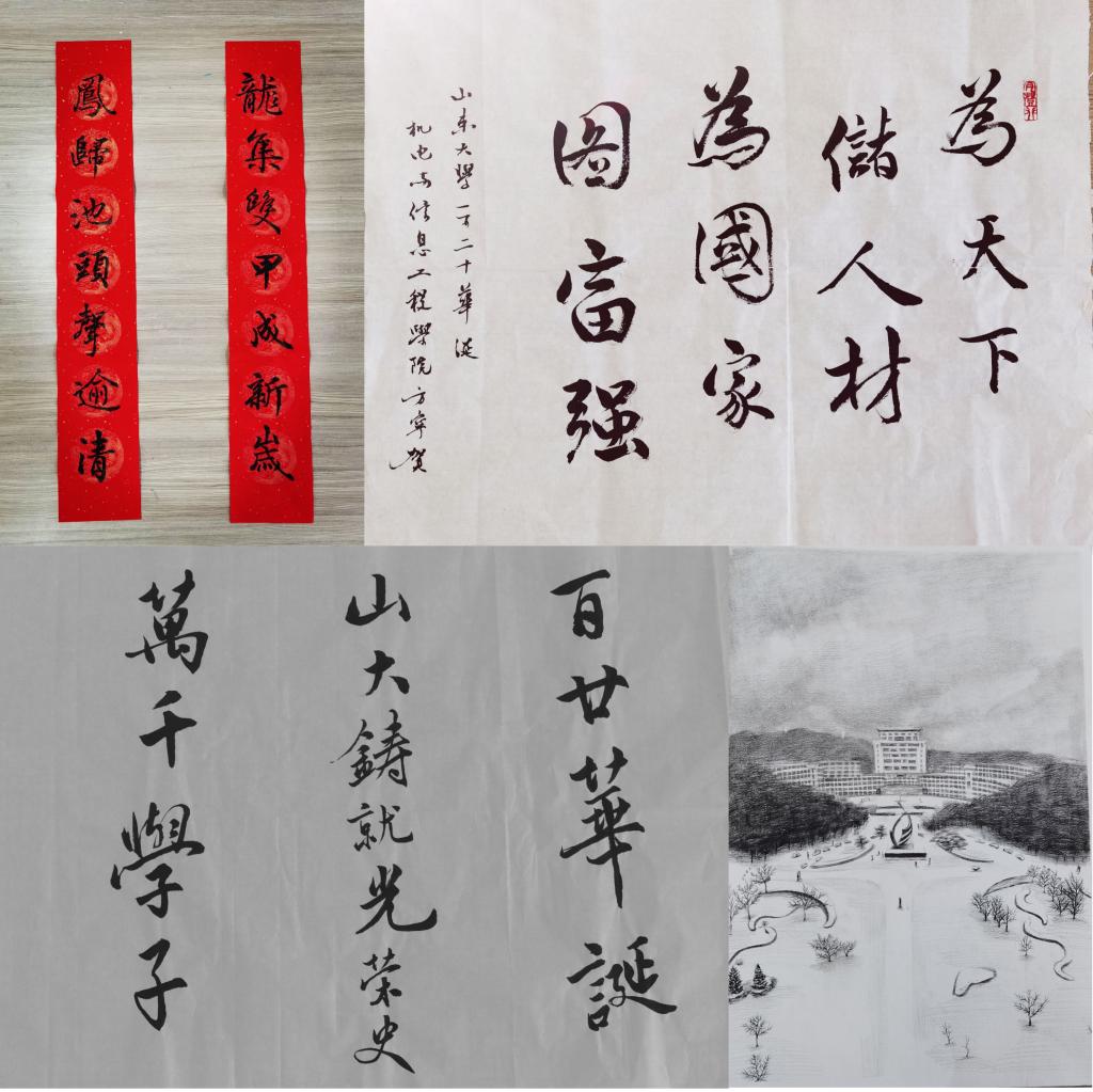 “笔墨情韵共绘青春”书画展以“弘扬传统文化,传承山大精神”为主题向全院征集优秀书画作品,同学们借笔墨书写对山大的美好祝愿,绘画作品构图巧妙,生动描绘出美丽的校园景色,书法作品遒劲有力,寄予了对母校的深情厚意。本次活动为学院书法、绘画爱好者搭建了艺术展示和交流的平台,提高了同学们对中国传统文化的认知和热爱。