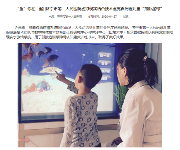 基于该成果研发的MR水族箱和课程已在济宁第一人民医院进行了长达3年的临床应用,切实帮助自闭症儿童提升康复训练效果,获得院方和自闭症儿童家长的一致好评。不仅如此,MR水族箱经调整后,已应用于济南市槐荫区第二实验幼儿园的普通幼儿教育中,实现了社会效益的辐射。