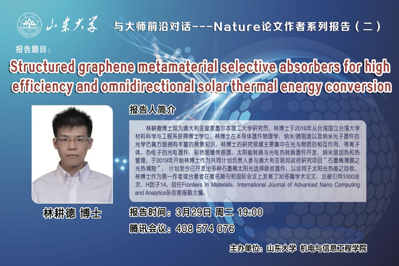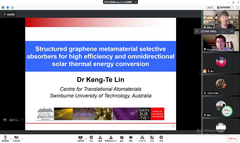 3月29日晚,第二场报告由澳大利亚皇家墨尔本理工大学林耕德研究员主讲,他介绍了结构石墨烯材料(SGM)的特性,石墨烯是以sp2杂化连接的碳原子紧密堆积,具有光学、力学等特性,在材料学、微纳加工等方面有重要的应用前景。会后,林研究员解答了同学们关于光热转换材料常见的应用场景等问题。