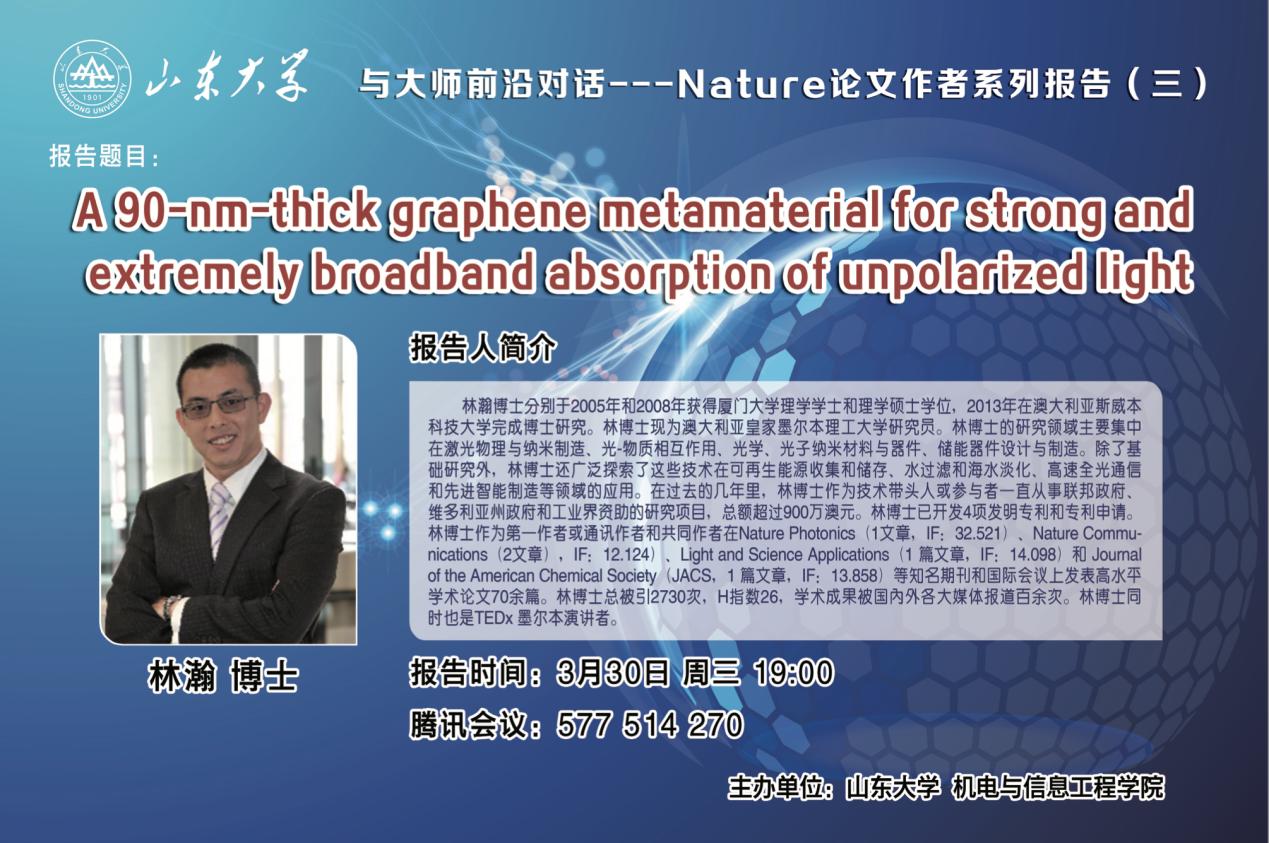 3月30日晚,第三场是澳大利亚皇家墨尔本理工大学林翰研究员以“A 90-nm-thick graphene metamaterial for strong and extremely broadband absorption of unpolarized light” 为主题的学术报告,主要讲述了可再生能源收集与存储,光电信息的处理与发送,介绍了Atomaterials材料(Atomaterials,一种新型的原子级材料,二维材料)的应用等内容。