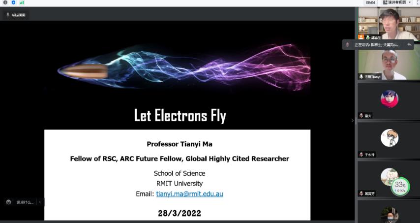3月28日晚,第一场报告由澳大利亚皇家墨尔本理工大学马天翼教授主讲,马教授由一个简单的析氢和析氧反应引出话题,他指出析氢和析氧反应是工业化生产中最重要的几种核心能源的核心反应,同时介绍了电催化和光催化在产生应用上的特性和局限性。报告最后,马教授回答了学生关于科研和学习方面的提问。
