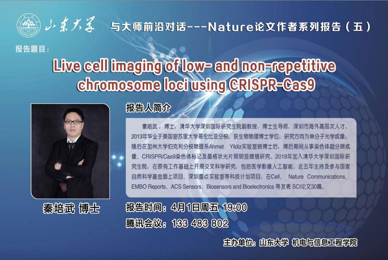 4月1日晚,第五场报告由清华大学深圳国际研究生院秦培武副教授主讲,他为同学们讲解了有关Nature文章中CRISPR相关的知识以及目前课题组研究的生物医学图像处理,其所在团队在CRISPR成像领域取得了很高的成就。他指出CRISPR原理主要是通过在失活RNA片段标记荧光标记现精确显示DNA、精确DNA分裂过程、体现有丝分裂活动强度、新冠病毒核酸检测、以及关于uptarget标靶对ontarget标靶的现象增强作用等。同时秦教授简要的阐述了医学人工智能领域,在眼科图像识别方面的作用,例如眼部图片的相应病变识别、眼镜度数预测、以及病理性近视的统计研究工作。