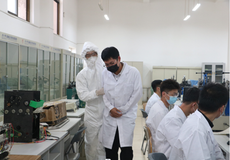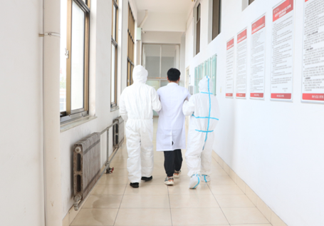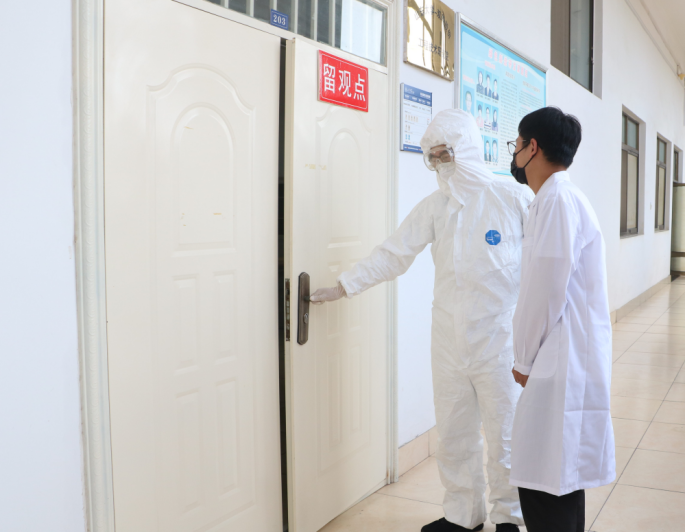 实验管理人员着套装将核酸初筛阳性学生带离实验室