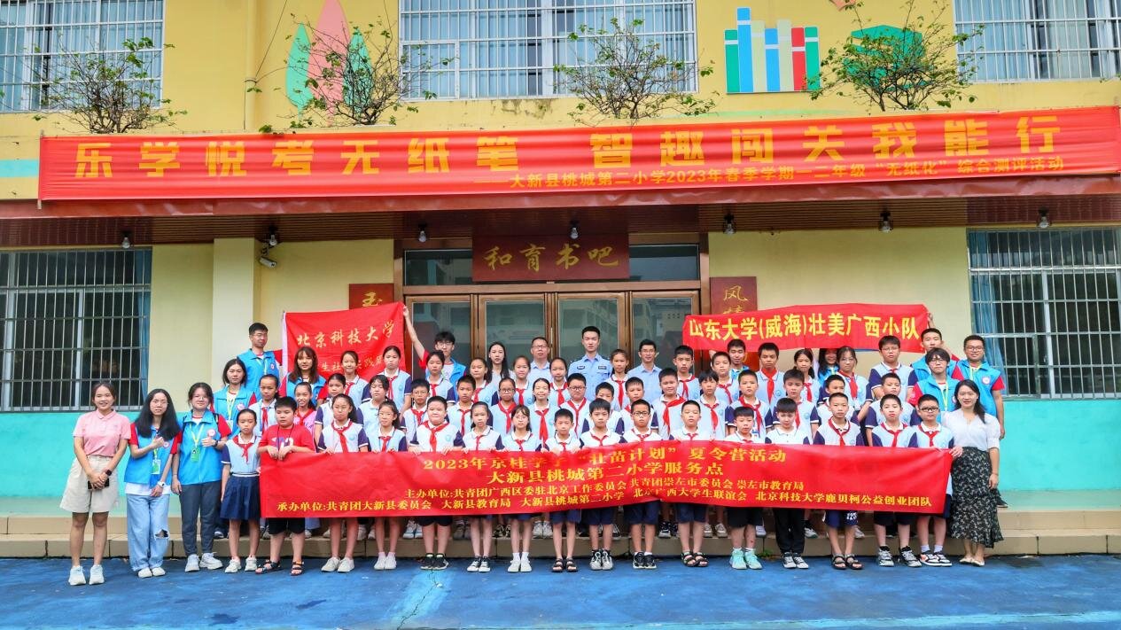壮美广西实践小队加入2023京桂学子“壮苗计划”夏令营支教活动,在大新县共青团、大新县教育局、大新县桃城第二小学等多方支持下,于大新县桃城第二小学开设夏令营支教点,自8月7日起开展为期两周的夏令营支教活动。夏令营开设走进围棋世界、篮球基础、折纸小课堂、音乐鉴赏、科学小实验、急救与安全知识、八桂文化、书法小课堂等近20门课程。夏令营共招收四、五、六年级学生46名,支教时间达40余小时,课程涵盖知识范围广,利于促进学生德智体美劳全面发展。团队支教活动由左江日报报道,得到大新县桃城第二小学、县教育局、大新县共青团团委等多方的表扬和认可。