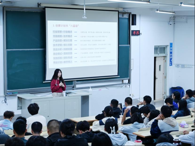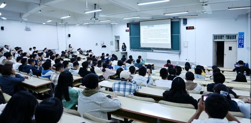 李欣茹从“挑战杯”全国大学生课外学术科技作品竞赛(以下简称‘大挑’)的时间历程切入,深入浅出地讲解了“大挑”的竞赛章程、团队分工等内容。通过对“大挑”国赛获奖项目的梳理分析,她强调个人积极的态度与踏实的作风是项目取得突破性发展的关键。同时,她还详细分享了比赛准备过程中的各大要素,包括材料准备、研究报告搭建、研究报告撰写特点及商业计划书框架搭建等。蒋雅雯向大家分享了商业计划书的撰写技巧以及双创赛事经验。她鼓励大家在平衡学业压力和竞赛工作中找到适合自己的路,保持久久为功的韧劲。同时她也建议同学们放宽眼界,了解行业需求与市场前景,进而选择适合自己的竞赛方向。在交流答疑环节,两位嘉宾有针对性地回答了同学们提出的问题,并鼓励大一同学拓宽视野、大胆创新,充实大学生活。