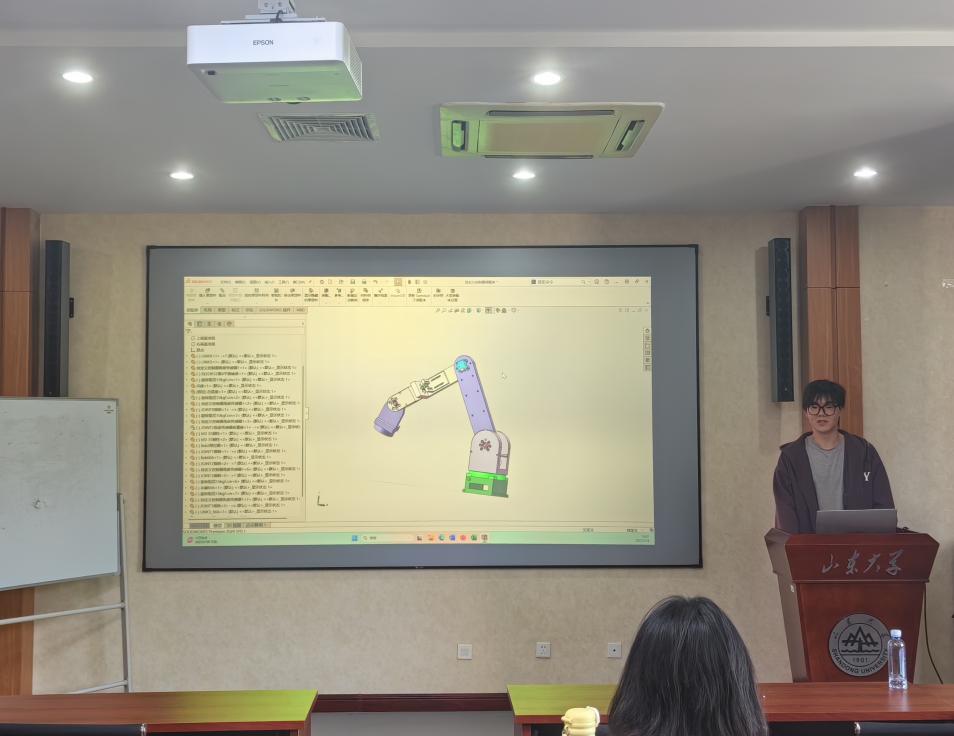 活动中,顾奕祺以“从零件到装配体”的递进式教学思路为核心,围绕SolidWorks软件的基础操作展开授课。他首先展示了一个五自由度机械臂三维模型,随后对机械臂装配体进行拆分讲解,逐一分析其中的核心零件,从基座、关节连接件到传动部件,详细讲解每个零件的功能与设计要点。
