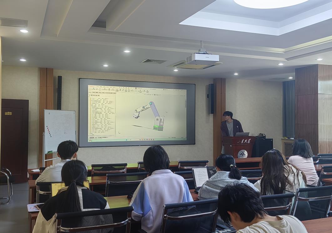 在互动环节,顾奕祺向同学们展示五自由度机械臂实物模型视频,直观呈现机械臂的运动效果与结构细节,让抽象的理论知识变得生动可感。互动过程中,同学们还就模型细节和优化方向等内容展开热烈讨论,现场学习氛围浓厚。