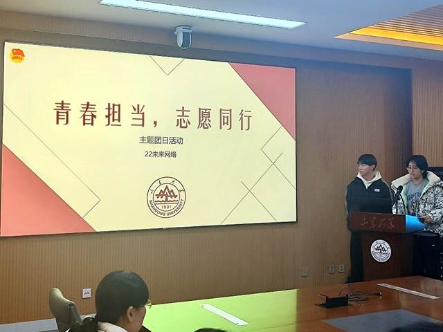 为促进同学们积极投身志愿服务活动,在志愿服务中践行社会主义核心价值观,传递社会正能量,展现山大学子的青春担当,22级未来网络实验班于2023年12月14日16点20分在知行北楼404教室开展了“青春担当,志愿同行”主题团日活动。本次活动由班长廖志烽、团支书王康璐瑶主持,邀请2020级软件工程本科生刘晓奇作为主讲人,班主任王文玉老师、辅导员孙慧敏老师出席此次活动,班级全体同学参加。