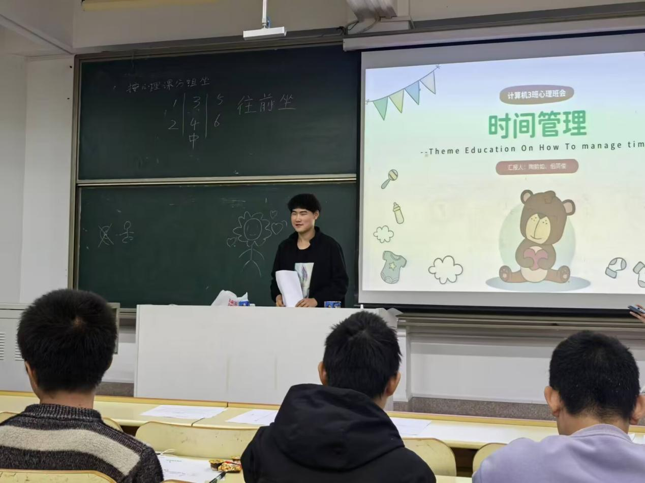11月1日18点,2024级计算机类03班在学院楼253教室开展了一场以“时间管理”为主题的心理活动班会,旨在帮助同学们提升时间管理能力和对时间的认知。本次班会由心理委员佀同俊和陶韵如共同主持,全体同学参加。