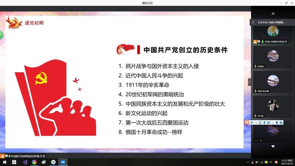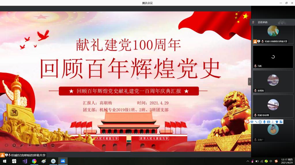 4月29日上午,19级机械设计制造及其自动化03班成功举办“百年荣耀,不忘初心”线上主题团日,本次活动由高朝杨主持,19级机械设计制造及其自动化03班全体成员参加。