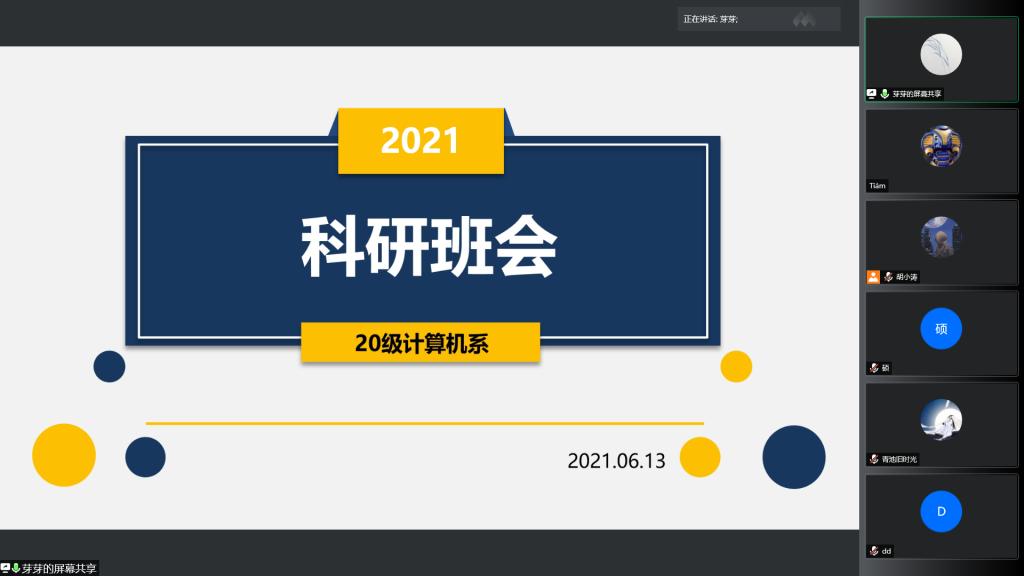 6月13日晚,20级计算机类三班,四班于腾讯会议举办了科研班会。本次活动由科研班主任韦纪宁学长主持,邀请了刘文涵、徐海洲、胡文涛等多位学长参会,计算机三班、四班全体同学参加。