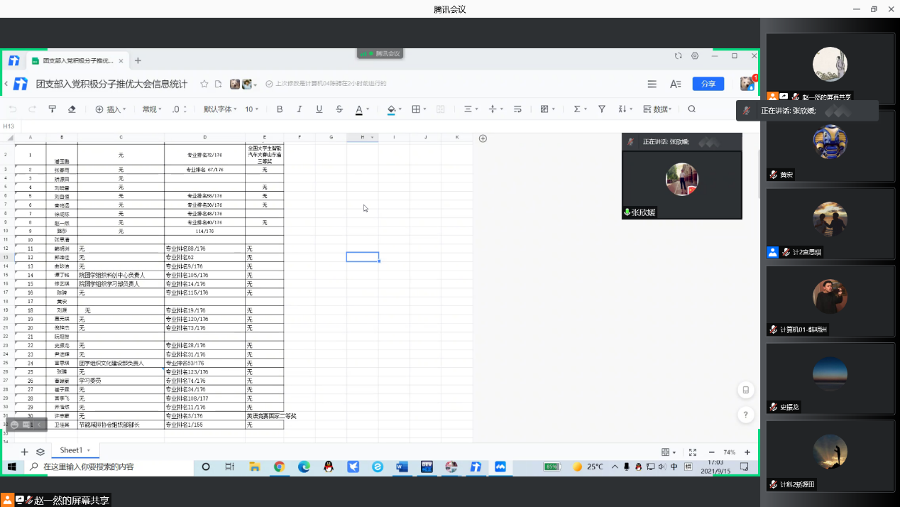 9月15日下午,20级计算机2班在腾讯会议召开了线上入党积极分子推优大会。本次会议由20计算机2班团支部书记宫思琪主持、班长赵一然辅助进行,辅导员张欣媛及班级全体团员参与。