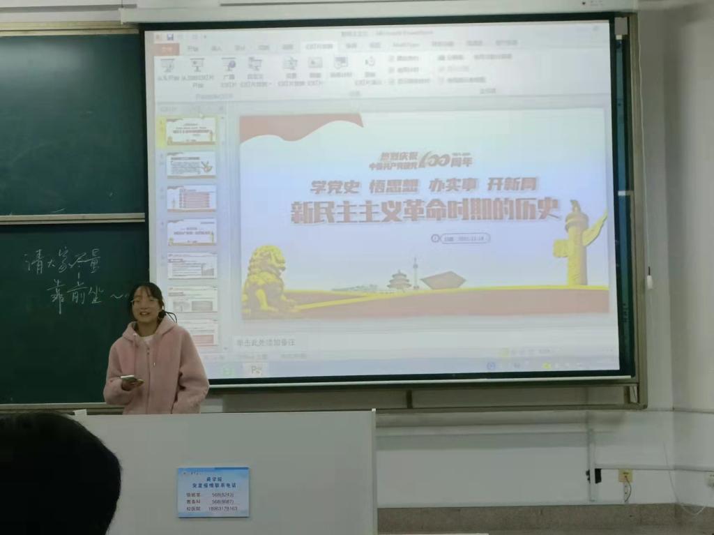 活动开始,计算机一班团支书唐钰琪进行发言,向大家介绍了新民主主义革命的概念,通过精彩的革命小故事引入主题。会议分为四个部分,分别由一班景天宇、向嘉楠、齐笑一、王鸿儒、孟祥瑞、宋子锐;二班舒启豪、高鹏程、刘雨桐、盛晨、王恒等同学林知讲解与分享,带领同学们走进中国共产党光辉的历史。