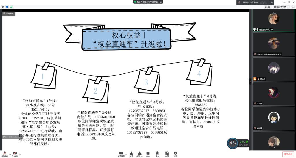 会议开始,赵亚宁介绍了当前疫情形势并带领同学们一起观看关于奥密克戎变异株的科普视频,让同学们进一步了解当前新冠肺炎疫情的严重性,同时强调学校对疫情防控的重视,要求同学们遵守学校防疫规定,积极弘扬抗疫精神,展现青年学子的责任与担当。随后向同学们介绍学校为保证学生正常生活与应急物资需要,升级了“权益直通车”,以供学生交流意见,反映问题,“权心权益”为学生服务。紧接着向同学们介绍了常见的网络电信诈骗的手段,让同学们提高警惕性。最后号召同学们参与“一小时劳动圈”宿舍实践活动,共同营造干净整洁的宿舍环境。