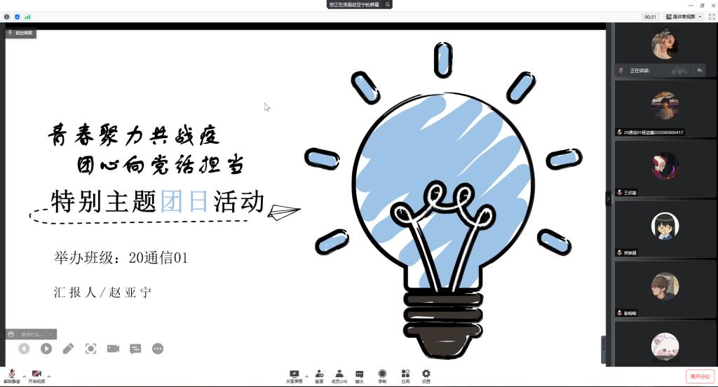 2022年3月16日星期三下午,20级通信01班举办主题为“青春聚力共防疫,团心向党话担当”的主题团日活动。本次活动全程线上举行,全员入会,由20通信01班团支书赵亚宁主持进行。