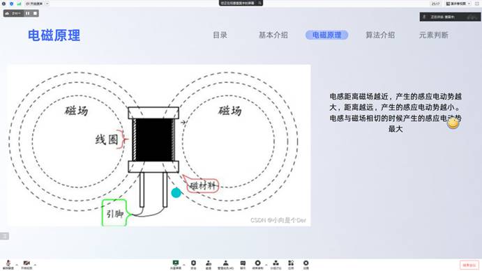 在培训开始时,董昊宇向同学们介绍了电磁组的基本情况,并带领同学们认识了电磁床干起的基本原理。随后董昊宇同学着重讲解了电感的排布策略和技巧,带领了同学们学习了滤波的意义及两种非常实用的滤波算法——限幅法滤波和算数平均滤波,并介绍了归一化和差比和的目的和方法并针对如何控制电机进行了讲解。最后,董昊宇针对两个难度较大的元素环岛和断路,给出了自己富有启发性的处理方法,使同学们在培训中收获成长。
