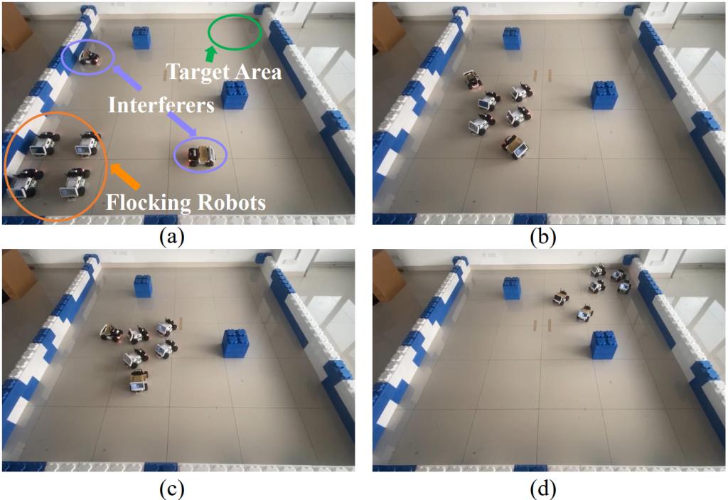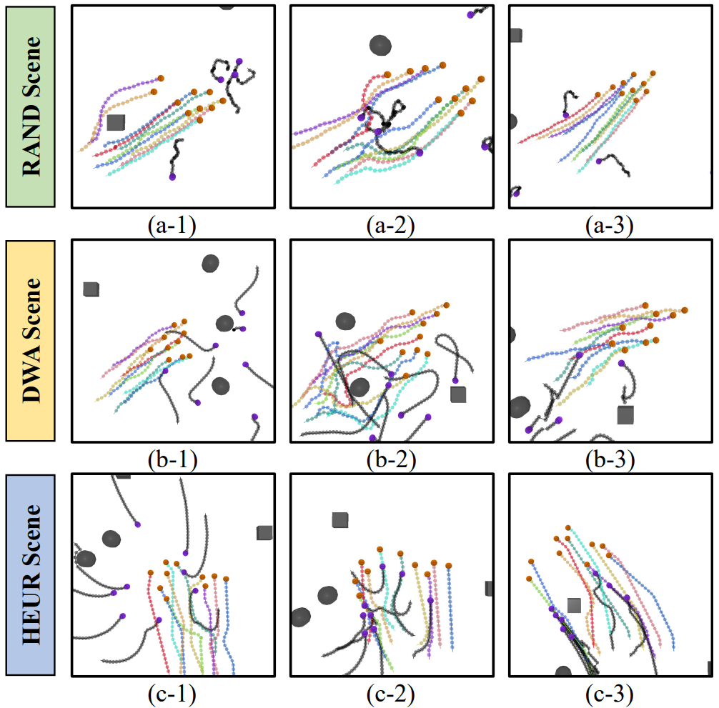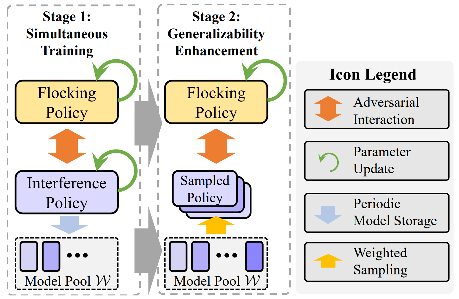 为解决动态、复杂环境下机器人集群导航的鲁棒性、高效性问题,团队提出了一种基于深度强化学习的非对称自博弈驱动的多机器人协同导航框架。机器人与潜在干扰者通过自我博弈的形式进行策略对抗,并在局部观测条件下持续调整决策,以摆脱对全局信息与中心化通信的依赖。提出的方法有效提升了机器人面对不确定环境时的自适应能力,通过多种干扰类型和不同规模下的鲁棒性测试验证了算法的优越性能。(如图1)。