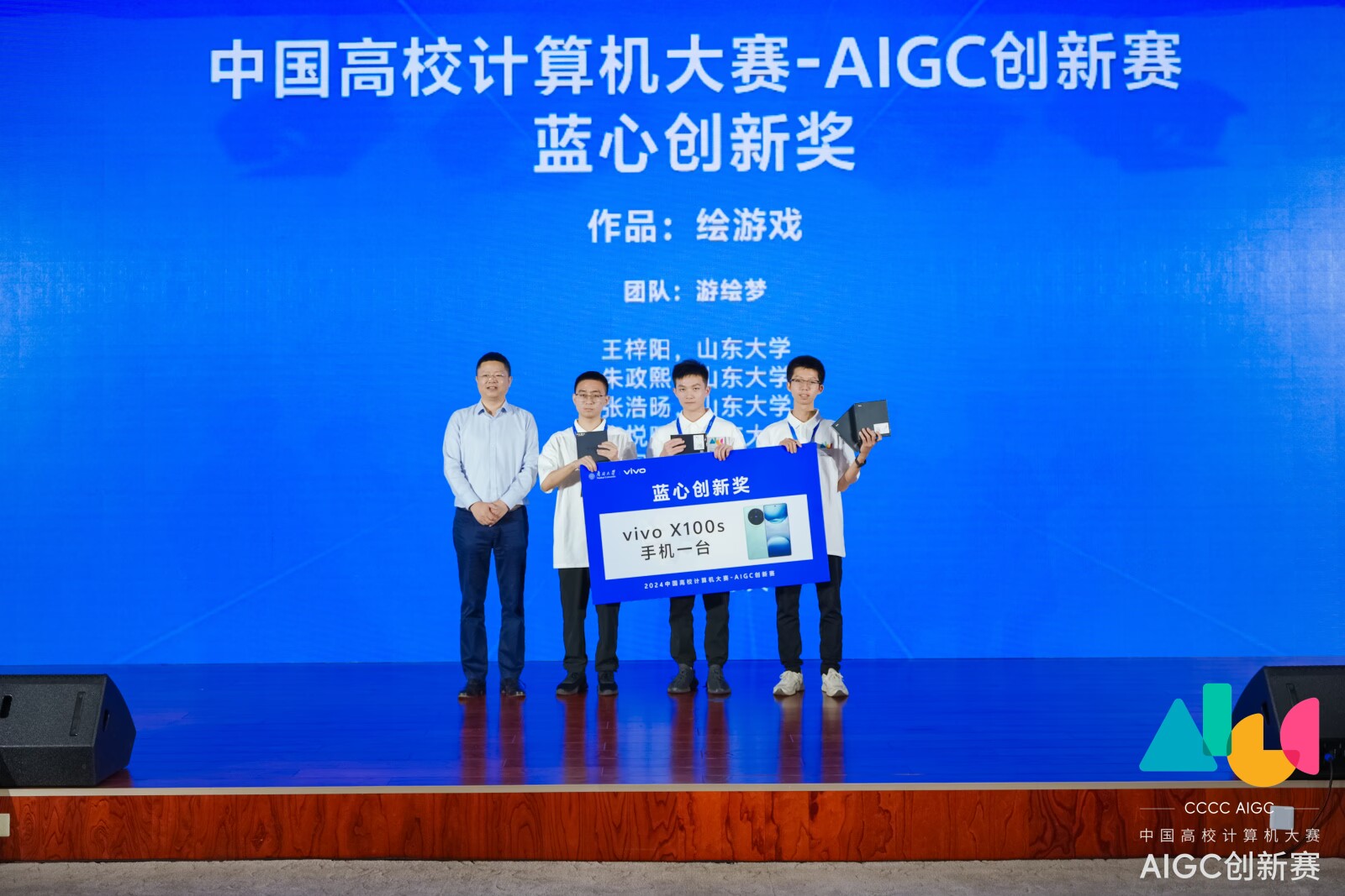 其中,星月忆语团队获得该赛事最高荣誉国家一等奖,中国高校计算机大赛组委会秘书长时阳为星月忆语团队颁奖;游绘梦团队获得蓝心创新奖,vivo副总裁、vivo AI全球研究院院长周围为游绘梦团队颁奖。